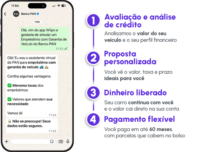 O empréstimo com automóvel de garantia é uma parceria entre a Wiipo e o Banco Pan, que permite transformar seu carro ou moto em uma solução inteligente de crédito, com condições mais vantajosas do que o empréstimo pessoal tradicional.